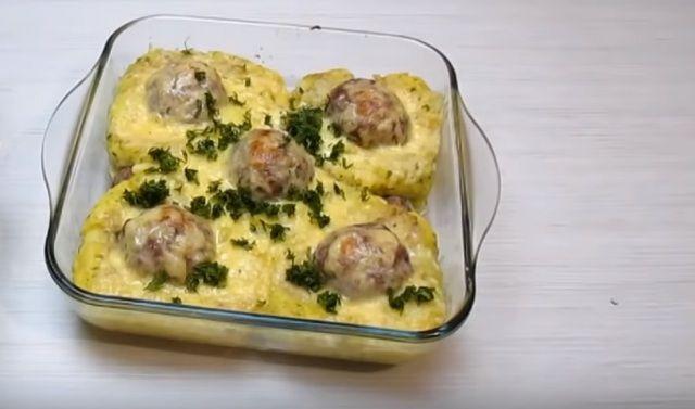 Mod de preparare: Curățați și spălați cartofii. Tăiați-i în bucățele și fierbeți-i până vor fi gata. Apoi scoateți-i din apă și puneți-i într-un vas potrivit. Adăugați untul, mărarul uscat, sare și piper negru măcinat. Pisați și amestecați totul cu zdrobitorul pentru piure până veți obține un piure omogen. Adăugați 50 g de cașcaval ras în piureul de cartofi și amestecați foarte bine. Modelați piureul de cartofi sub formă de bile. Puneți-le într-un vas adânc, termorezistent. Apoi, folosind fundul unui pahar, presați fiecare bilă de cartofi și realizați câte o adâncitură în mijlocul ei. Astfel o veți transforma în „cuib”. Amestecați carnea tocată cu ceapa tăiată foarte mărunt sau dată prin răzătoare, sare și piper negru măcinat după gust. Modelați chifteluțele din compoziția obținută și puneți-le în „cuiburile” de cartofi. Introduceți tava în cuptorul preîncălzit până la 180°C și coaceți chifteluțele pe parcursul a 30 minute. Scoateți tava din cuptor și presărați mâncărica cu cașcaval ras. Apoi coaceți-o timp de încă 5-7 minute. Presărați mâncărica cu verdeață mărunțită și serviți-o.
