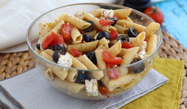 Mod de Preparare: Gatiti pastele in functie de timpul de gatire indicat pe ambalaj. Clatiti-le in apă rece pentru a le raci rapid. Adaugati branza, rosiile si maslinele tăiate. Adaugati ierburile de Provence si amestecati. Se amesteca uleiul de masline cu otetul balsamic, sarea, piperul si se pune peste salata acest sos.