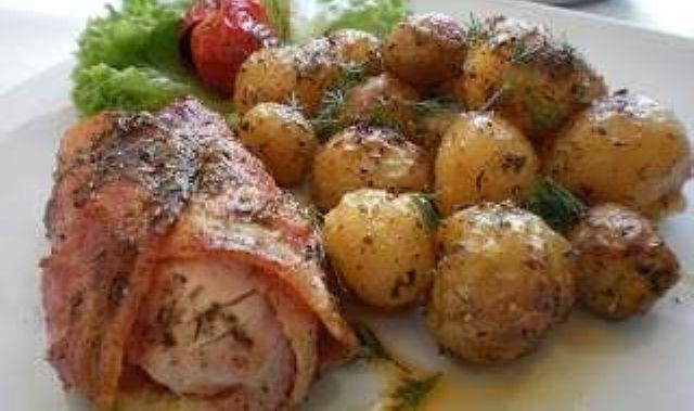 Mod de Preparare: Cartofii noi se curata de coaja si se pun la fiert. Cand sunt suficient de patrunsi se scot se stropesc cu ulei de masline 2-3 lg si se condimenteaza cu un amestec din sare, piper, ierburi provance, praf de usturoi si boiaua de ardei dulce ghimbir. Pregatim pieptul umplut astfel: jumatatile de piept de cresteaza pe lateral, le condimentam cu sare si introducem in buzunarelul format doua felii de cascaval si o felie de pastrama. Se inveleste in cate doua felii de rulada de porc si se aseaza in forma de graten sau tava pe care o stropim cu putin ulei. Se pun si cartofii condimentati, turnam cam 200 ml apa incet pentru a nu spala cartofii de condimente si dam la cuptor pana ce pieptul e bine patruns si cartofii aurii. Se serveste alaturi de o salata de sezon in cazul meu o salata de varza alba.