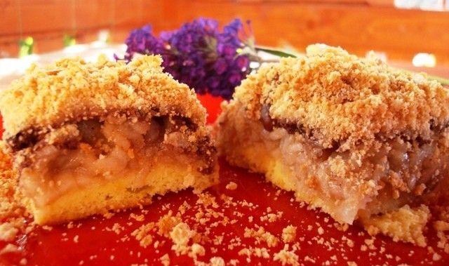 Mod de Preparare: Merele curatate de coaja si rase se calesc intr-o cratita, la foc mic, cu scortisoara si zahar. Untul se taie felii subtiri si se aseaza in tava. Biscuiti sfaramati se presara in tava, peste feliile de unt apoi adaugam merele calite nivelandu-le cu ajutorul unei spatule sau cutit lat. Cand merele sunt complet racite se adauga pandispanul facut din doua oua. Se da prajitura la cuptorul incins, la 180*C pentru 20-25 minute, pana cand capata o culoare aurie. Cand prajitura este complet racita, se rastoarna pe un platou, se poate orna cu frisca sau nu, se taie felii si se serveste.