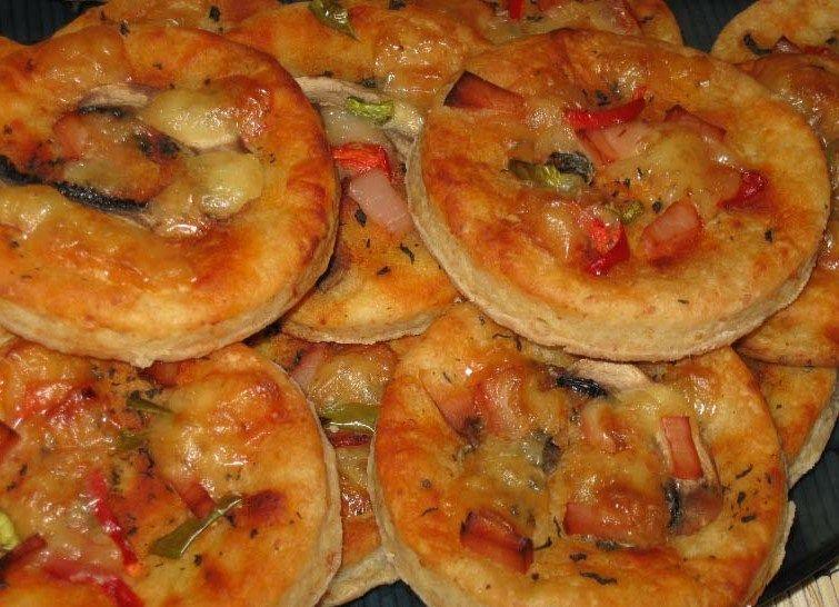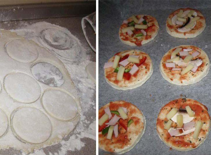 Cu ajutorul unui pahar taiem rondele din aluat si le asezam in tava acoperita cu hartie de copt. Ungem fiecare pizza cu sos de rosii, presaram putin cimbru, si asezam felii subriti de ciuperci, sunca, cascaval si ardei, in diverse combinatii.
