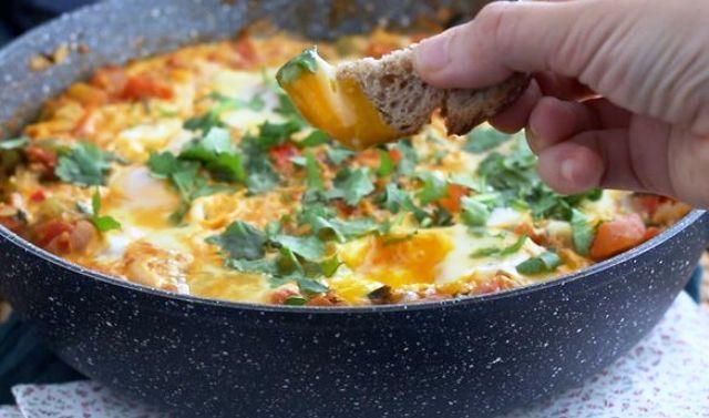 Mod de Preparare: Curatati si tocați ceapa. Scoateti semintele din ardei si taiati-i in cubulete. Taiati rosiile in cubulete. Intr-o tigaie puneti putin ulei de masline si caliti ceapa tocata. Cand devine translucida, adaugați ardeii, patrunjelul tocat si jumătatea din coriandru tocat. Se acopera si se gateste aproximativ 10 minute. Adaugati condimentele, amestecati, apoi adaugati rosiile. Lasati sa fiarba aproximativ 20 de minute la foc mediu. Spargeti ouale in 4 locuri din tigaie, acoperiti si gatiti. Se presara cu restul de coriandru tocat si se serveste! Pofta buna!