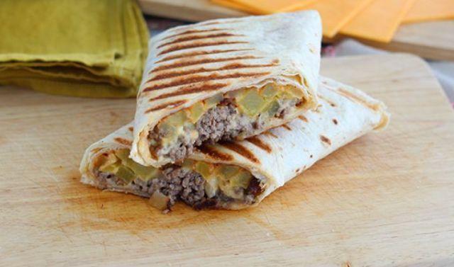 Asamblarea: Aranjați cate doua tortilla, una usor peste cealalta. Intindeti sosul de gratar (pastati marginile curate). Puneti jumatate din cantitatea de cartofi in centru. Adaugati jumatate din sosul de branza deasupra si puneti jumatate din carnea tocata. Puneti alimentele in centru (formand un dreptunghi) pentru a usura plierea. Pliati marginile, incepand de la marginea superioara, apoi cea dinspre dvs., apoi laturile, incercand sa impachetati compozitia in interior. Intoarceti taco-ul si gatiti-l pe grill timp de 3 minute (3 minute pe fiecare parte, pornind de la partea cu marginile pliate pentru a le sigila). Faceti acelasi lucru cu al doilea si gata!