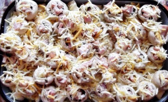 Mod de Preparare: Pentru inceput spalati bine cartofii, daca sunt noi, ca in cazul meu, ar fi mai ok sa-i fierbeti intai si apoi sa-i bagati la cuptor. Eu nu i.am fiert, doar i-am spalat si i.am taiat in 4. Din cauza ca ciupercile se coc mai repede decat cartofii, nu puteti lasa foarte mult la cuptor, iar cartofii de la suprafata or sa fie putintel mai tari decat restul. Ungeti tava cu unt, asezati cartofii, taiati coditele de la ciuperci in doua (logic, spalati ciuprcile prima data) si le asezati peste cartofi, taiati bucatele de unt si le distribuiti egal in tava, turnati laptele, presarati condimentul pentru cartofi, apoi presarati cascavalul sau amestecul de branzeturi. Asezati palariile de ciuperci pesste ce aveti deja in tava, taiati sunca sau kaiserul cubulete mici si puneti in fiecare ciuperca 3-4 cubulete, apoi presarati cascaval sau amestec de branzeturi peste ciuperci. Ultimul pas consta in amestecarea celor doua oua si cu o furculita puneti putin ou pe fiecare ciupercuta si ce va ramane turnati printre ele, pe cartofi. Incingeti cuptorul vreo 10 minute inainte de a baga tava la cuptor, iar de lasat le lasati pana se rumenesc ciupercile si incercati cartofii cu o furculita. Daca nu pot fi patrunsi usor mai lasati sa se coaca, ciupercile chiar si rumenite bine vor avea un gust foarte bun. Teoretic ar dura cam o ora. Daca sunt cartofii fierti in prealabil o sa dureze mai putin. Este o mancare destul de usoara, cartofii vor imprumuta mult din gustul untului, laptele o sa le dea un gust dulceag, numai bun, iar ciupercile sunt divin.