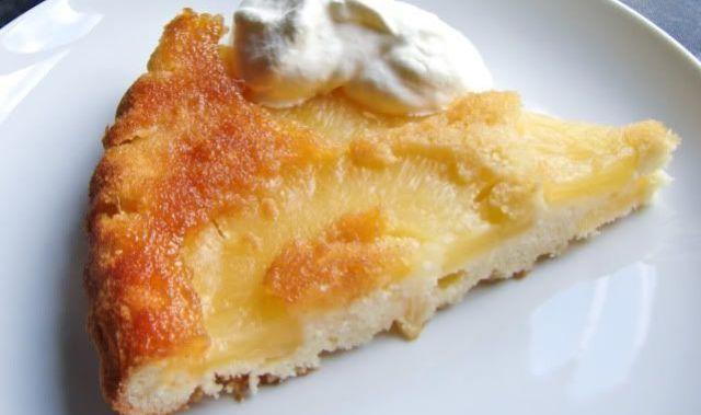 Mod de Preparare: Rondelele de ananas se scot din conserva si se scurg de suc. 7 se pastreaza intregi iar 3 se taie bucatele mici. Pentru aluat, untul trebuie sa fie moale, la temperatura camerei. Se bate untul cu zaharul, se adauga praful de copt si apoi se incorporeaza, altarnand, faina si cele 2 oua.