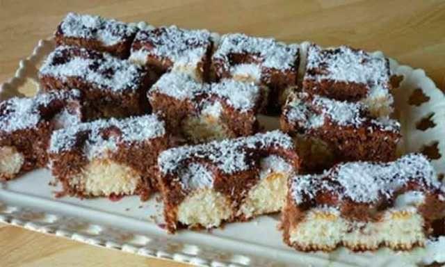 Prepararea bilutelor de cocos: Galbenusul oului se amesteca cu nuca de cocos, laptele condensat si albusul batut spuma. Din acest aluat formati bilute mici pe care le introduceti in aluatul de ciocolata. Coaceti prajitura la 200 de grade, timp de 20-30 de minute. Se presara cu nuca de cocos si se lasa la rece pana a doua zi.