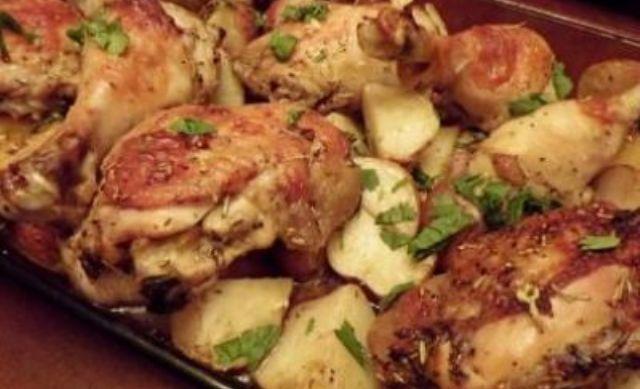 Mod de Preparar: Intr-un castron amestecati uleiul cu mustarul, otetul, cimbrul, rozmarinul, usturoiul pisat, sarea, piperul. Taiati o lamaie in doua si stoarcetii sucul, apoi adaugati-l in castronul cu sos si mirodenii. Asezati pulpele de pui intr-o cratita mare si turnati sosul obtinut. Taiati si cealalta lamaie in doua jumatati si adaugati-le in cratita unde se afla pulpele de pui si sosul pentru marinat. Lasati-le sa stea la marinat in frigider cateva ore (10-12). Incingeti cuptorul la 200 grade. Turnati sosul marinat intr-o tava mare de cuptor, adaugat cartofii noi taiati pe jumatate, iar deasupra aranjati pulpele de pui avand grija sa puneti inclusiv jumatatile de lamaie, si orice alte urme de cimbru, rozmarin, usturoi. Dati pulpele de pui cu cartofi si ierburi in cuptorul incins timp de 50-60 minute sau pana cand cartofii sunt copti, iar pulpele sunt rumenite si patrunse. Cand serviti pulpele de pui cu cartofi la cuptor si ierburi presarati deasupra patrunjelul tocat.