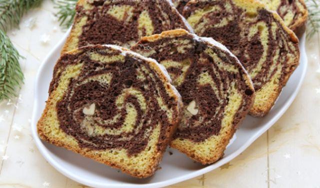 Mod de preparare: Se mixează pe rând zahărul cu ouăle, timp de 5 minute, apoi se adaugă untul moale, praful de copt, laptele și făina, amestecând bine după fiecare ingredient. Jumătate din aluat se toarnă într-un alt vas. Se adaugă cacaua într-o parte a aluatului și se amestecă. Se toarnă alternativ cele două compoziții în tava de chec unsă cu unt. Se lasă la cuptor maximum 45 de minute, se scoate din tavă și se lasă la răcit.