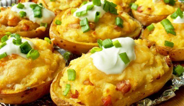 Mod de Preparare: Spalati bine cartofii. Stergeti-i si infasurati-i in folie de aluminiu si puneti-i in cuptorul preincalzit la 180° C timp de aproximativ 1 ora. Interiorul trebuie sa se coaca. Intre timp, se caleste ceapa cu un pic de ulei de masline pana devine translucida. Se adauga baconul. Puneti deoparte cand este gata. Taiti cartofii in jumatate. Scobiti miezul cartofilor si adaugati-l la amestecul anterior. Adaugati smantana, cascvalul si ceapa verde tocata si amestecati. Condimentati dupa gust. Umpleti jumatatile de cartofi cu umplutura si rumeniti la cuptor pentru aproximativ 15 minute la 180° C. Decorati cu ceapa verde tocata.