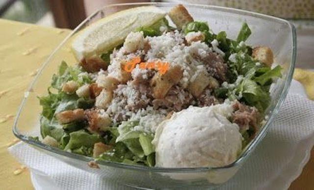 Mod de Preparare: Facem o maioneza rapida dintr-un ou, cu mustar si lamaie din belsug si evident ulei si un catel de usturoi zdrobit. Tocam ceapa, cateii de usturoi. Prajim painea la prajitor, in cuptor sau in tigaie, dupa care adaugam putin ulei de masline intr-o tigaie, cam o lingura, alti 2 catei de usturoi maruntiti si perpelim rapid painea in ea, pana absoarbe tot uleiul. Intr-un castron mare rupeti salata verde cu mana, adaugati castravetii taiat cubulete, ceapa, usturoiul, uleiul de masline, zeama de lamaie si sosul worchester, apoi eventual repartizati salata in castroane mai mici, adaugati deasupra tonul bucati cu ulei cu tot, crutoanele, maioneza, sare si piper, parmezan ras si verdeata. Intotdeauna lasati musafirii sa-si potriveasca de sare salata daca contine frunze verzi, fiecare dupa preferinta, pentru ca daca eventual ramane salata in bolul mare, se va pastra bine la frigider, fara sa se fleoascaie.