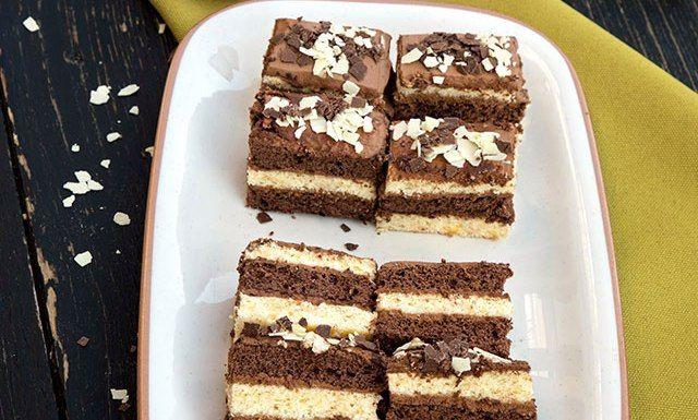 Mod de preparare: Am pornit cuptorul pe ventilatie la 180°C, apoi am mixat ouale cu un varf cutit de sare, zaharul tos si cel vanilat timp de 5 minute, la viteza mare. Ouale si-au dublat volumul si au devenit cremoase. Am adaugat pasta de vanilie si am amestecat putin. Daca folositi esenta naturala sau alat esenta o puneti doar dupa ce adaugati faina. Am incorporat faina cernuta in prealabil si amestecata cu amidonul. Am pus aluatul in tava tapetata cu hartie de copt si l-am copt 15 minute in cuptorul preincalzit la 180°C. Cat timp s-a copt blatul cu vanilie am spalat paletele de la mixer si bolul, apoi am pus 4 oua intregi in vasul mixerului, am adaugat varf cutit de sare, zahar tos si zahar vanilat si am mixat 5 minute la viteza mare. Am incorporat faina cernuta cu amidon si praf de cacao (cacao in mod special pentru ca face bulgarasi), apoi am pus cateva picaturi de esenta de rom si am amestecat. Am turnat aluatul in tava tapetata cu hartie de copt si l-am copt 15 minute. Cat timp s-a copt blatul cu cacao am inceput sa pregatesc crema de ciocolata. Am pus la topit la baine-marie ciocolata cu 3 linguri lapte. Cand s-a topit ciocolata am luat-o de pe foc, am pus untul si am amestecat, am adaugat scortisoara si lichiorul de portocale, apoi am turnat treptat smantana pentru frisca mixand la viteza medie spre mare. Am continuat acest lucru pana am terminat smantana pentru frisca. Am lasat blaturile sa se raceasca, apoi le-am taiat in 3. Am folosit o linie pentru a le taia, astfel incat toate sa aiba aceeasi dimensiune. Am grupat blaturile astfel incat sa alternez culorile. Peste blatul alb am pus crema, apoi blat cu cacao, crema si iar blat vanilat. Peste blatul cu cacao am pus crema, apoi blat vanilat, crema si iar blat cu cacao. In concluzie obtinem 2 randuri de prajitura cu crema in strat subtire intre foi, dar avem grija sa pastram crema si pentru a le glazura. Am taiat cuburile de prajitura dupa 30 minute, dar nu am pus prajitura in frigider in acest timp. Am folosit fulgi de ciocolata pentru decor, dar voi puteti pune orice va place. Daca se intareste crema si nu se lipesc fulgii sau alte decoruri puteti sa incalziti un cutit cu lama lata la flacara focului si il plimbati usor peste crema. Crema se va topi usor si puteti presara decorurile, ce se vor lipi in acest moment.