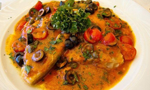 Mod de Preparare: Se pun 4 linguri ulei de masline intr-o cratita pe foc, se adaug usturoiul si se prajete usor pentru 30 de secunde. Se scoate si se adauga ceapa tocata fin. Cand devine sticloasa se adauga pasta de tomate si se amesteca inca 30 de secunde. Apoi adauga rosiile taiate si se fierb timp de 10-15 minute pana se ingroasa. Adaugati zaharul si condimentati cu sare si piper. Dati deoparte. Intr-o tava de cuptor puneti cele 3-4 linguri de ulei de masline ramase. Puneti bucatile de cod cu partea alba in sus si pielea jos. Turnati peste peste sosul de tomate si imprastiati maslinele fara samburi si taiate in felii. Se coace în cuptor timp de 10-15 minute pana cand carnea a devenit opaca. Se scoate din cuptor si se presara cu frunze de patrunjel tocat, inainte de servire.