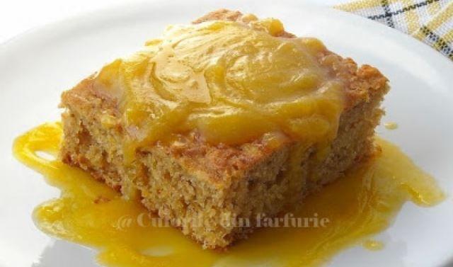 Se toarna totul intr-o forma de 22x30 cm., cu hartie de copt si se coace timp de aproximativ 40 de minute. Se incearca cu scobitoarea daca este gata. Se rastoarna pe un gratar si se lasa sa se raceasca. Se taie in felii si se pot servi presarate cu zahar praf sau cu sos de lamaie.