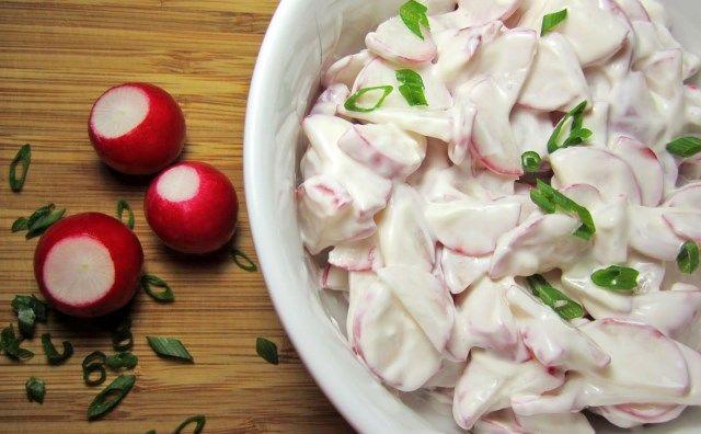 Mod de Preparare: Ridichile se curata, se spala si se taie felii. Ceapa se curata, se spala si se taie rondele subtiri. Se pune, apoi, in acelasi vas cu ridichile si se sareaza totul. Chefirul se amesteca cu piperul macinat, zeama de lamaie, mustarul si zaharul. Sosul de chefir se toarna apoi peste ridichile si ceapa, scurse de zeama. Se aranjeaza salata in boluri.