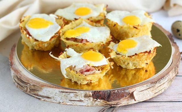 Mod de Preparare: Curatati cartofii si dati-i pe razatoare. Puneti-i intr-un prosop si stoarceti cat mai bine pentru a scoate apa din ei. Dupa ce i-ati stors puneti-i intr-un vas, apoi adaugati cele 2 oua, sare, piper si amestecati bine. Puneti 1 lingura cu varf din amestecul de cartofi in fiecare forma de briosa, unsa in prelabil. Apoi, cu degetele, presati cartofii pana la margini pentru a forma cuiburile. Puneti in cuptor si coaceti timp de 12 minute la 180° C. Taiati sunca presata in bucati mici si caliti intr-o tigaie fierbinte. De asemenea, gatiti ouale de prepelita in tigaie. Cand cuiburile de cartofi s-au gatit, lasati-le sa se raceasca cateva minute, apoi desfaceti-le usor. Puneti cascaval ras pe fundul fiecarui cuib, apoi cateva bucati de sunca si acoperiti cu un ou de prepelita prajit. Gata!