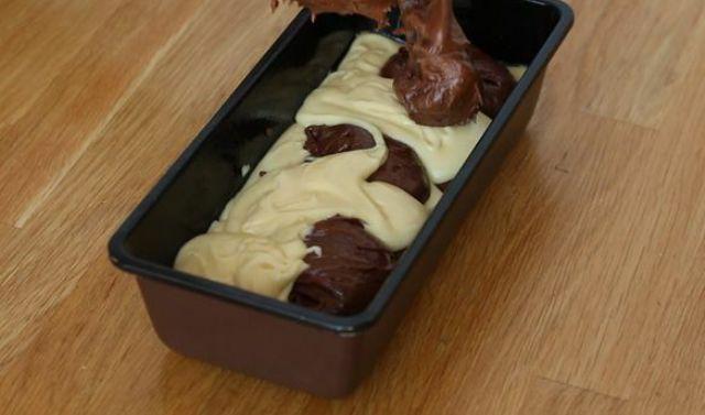 Aluatul cu ciocolata: Repetati pasii de preparatul anterior, dar topiti untul cu ciocolata inainte de a-l incorpora in amestec. Amestecati bine si lasati deoparte. Preincalziti cuptorul la 165° C. Ungeti cu unt forma de chec. Folosind doua linguri, introduceti alternativ o lingura de aluat simplu si una de aluat de ciocolata, in tava de copt. In cele din urma, faceți „valuri” deasupra cu o spatula au o furculita, pentru a amesteca cele doua aluaturi. Introduceti la cuptor pentru 50 de minute la 165° C. Scoateti tava din cuptor si lasati-o sa se raceasca complet.