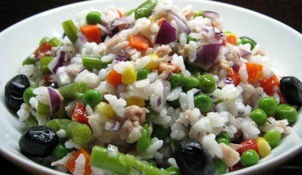 Mod de Preparare: Orezul se pune la fiert in apa cu sare conform instructiunilor de pe cutie. Cand este gata se clateste sub jet de apa rece. Legumele se trag in tigaie cu putin ulei de masline si se lasa la racit. Ceapa se taie marunt, julien, rondele sau cum se nimereste. Maslinele se taie si ele rondele mici. Cateva se pot lasa intregi. Se amesteca toate ingredientele pentru salata si deasupra se toarna dressing-ul. Se poate servi ca si aperitiv sau ca si fel principal. E o masa completa si usoara pentru serile in care nu avem chef de mancaruri elaborate.