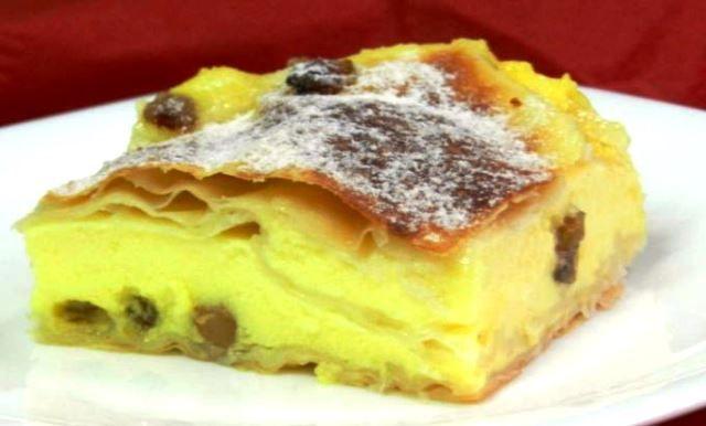 Mod de preparare: Bate ouăle cu un strop de sare și lasă deoparte totul, ulterior verifică foile din pachet. Unge tava cu unt topit și așează foile câte două pe care să le ungi cu grăsimea pregătită. Amestecă iaurtul cu ouă, zahăr și aromele alături de stafide și griș și toarnă cu un polonic peste foi. Pune 2 foi, iar mai apoi din nou iaurt până când se termină compoziția. Ultimul strat trebuie să fie de foi de plăcintă pe care să o ungi cu unt. Se lasă la răcit preț de 15-20 de minute, mai apoi se tapeteză cu zahăr pudră și se servește. Poți să-i adaugi mai multe stafide sau să pui în compoziție doar câteva linguri de brânză proaspătă de vaci.
