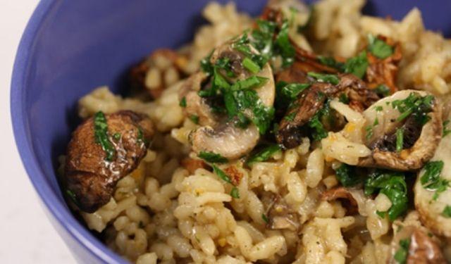 Mod de Preparare: Curatati ciupercile si taiati-le in bucati. Separati-le in doua parti. Intr-un bol de salata, diluati cubul de supa de legume in 500 ml de apa fierbinte. Intr-o cratita, se toarna o picatura de ulei de masline si se soteaza ceapa tocata, aproximativ 2 minute. Adaugati o parte din ciuperci si amestecati. Adaugati supa de legume diluata. Acoperiti si fierbeti timp de cateva minute la foc mic, astfel incat supa sa inmoaie ciupercile. Intr-o tigaie, turnati o picatura de ulei de masline si adaugati orezul. Se amesteca pana devine translucid. Adaugati vinul alb pentru a deglasa si continuati sa amestecati. Adaugati un polonic de supa si amestecati pana cand orezul a absorbit totul. Repetati pana cand ati terminat supa. Dupa ce ati adaugat ultimul polonic de supa la risotto, luati o tigaie pentru a gati cealalta jumatate de ciuperci. Adaugati o picatura de ulei de masline si caliti catelul de usturoi pentru cateva secunde. Adaugati ciupercile si caliti-le. La sfarsitul gatitului, adaugati patrunjelul tocat si pastrati putin pentru decor. In timp ce risotto-ul este in tigaie si ciupercile s-au calit, pregatiti un platou de servire! Într-un platou adanc, aranjati risotto-ul formand o gropita in centru. In interior asezati ciupercile prajite. Puneti patrunjel tocat si gata!