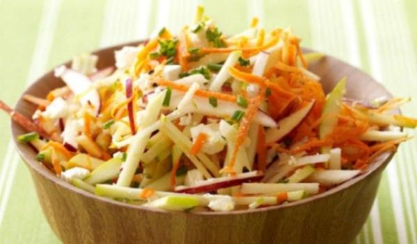 Merele se curata pe rind si la fel se trec pe rind prin razatoare amestecind totul dupa fiecare mar ras. Asta pentru a nu-se oxida merele. Dupa ce totul a fost recut prin razatoare se adauga restul ingredientelor in afara de seminte. Se amesteca bine toate ingredientele, evetual se mai poate adauga dupa gust, cite ceva din ingredientele dorite. Se serveste presarata cu seminte prajite deasupra.