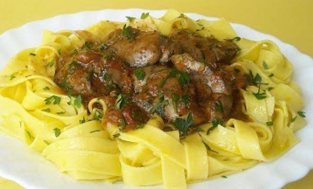 Mod de Preparare: Pastele, tagliatelle se fierb dupa indicatiile de pe ambalaj. Se scot intr-o sita si se trec printr-un jet de apa in asa fel incat sa nu se raceasca. Ficatei de pui se spala, se condimenteaza si se pune la fript intr-o tigaie cu 3-4 linguri de ulei. Se adauga usturoiul si se caleste 2-3 minute, apoi se scoate. Rosiile se taie cubulete si se adauda si ele peste ficatei impreuna cu pasta de tomate. Se lasa cateva minute. Se aseaza pastele pe o farfurie si deasupra se pun ficatei de pui si sos. Se presara busuioc proaspat tocat.