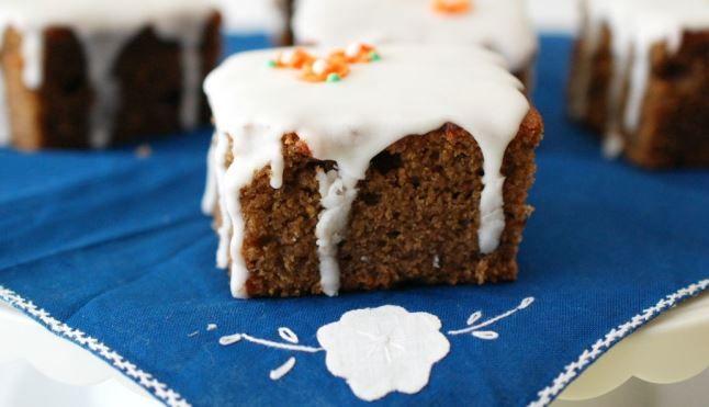 Pregatim glazura – punem crema de de branza peste unt si adaugam zaharul pudra. Amestecam usor, cu o spatula, cat sa incorporam putin zaharul. Batem bine glazura, cu ajutorul mixerului, pana cand zaharul se topeste si obtiem o crema tartinabila, lucioasa si fina. Cand prajitura este complet racita, punem deasupra glazura si o intindem uniform. Portionam si ornam cu nuca sau coaja rasa de portocala. Servim (cu extra glazura).