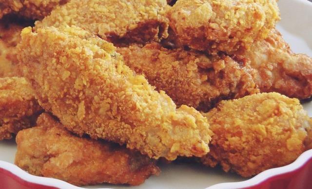 - in al treilea amesteci restul de faina, cu fulgii sfaramati, pesmetul, un varf de cutit de boia si un varf de cutit de chilli. Fulgii ii poti sfarama punandu-i intr-o punga peste care treci cu facaletul sau in robot. Aripioarele le speli si le stergi cu prosoape de hartie apoi le treci pe rand prin primul vas, apoi prin al doilea si prin al treilea. Le pui la prajit cand uleiul din tigaie e incins (cam 2 degete de ulei) si le lasi pana se rumenesc frumos (cam 10 minute), intorcandu-le de pe o parte pe alta. Le scoti pe o farfurie cu servetele pentru a asborbi surplusul de ulei si eventual, le tamponezi deasupra cu inca un servet. Serveste-le cu salata, cu piure sau cu cartofi prajiti. Pofta buna!