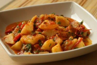 Ingrediente: cartofi, roșii, ceapă (ceapă verde sau orice fel de ceapă), un gogoșar, pătrunjel verde.