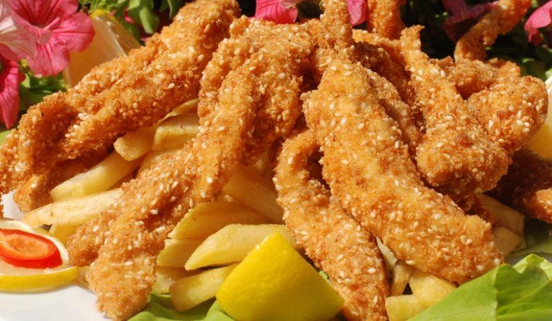 Mod de Preparare: Pieptul de pui se taie in fasii lungi, se amesteca impreuna cu usturoiul dat pe razatoare, sarea, piperul si ce condimente mai doriti sa puneti... se de la frigider 1 ora-2 ca sa isi faca rostul toate condimentele. Oualele se bat bine mai adaugati putina sare si piper, pesmetul se amesteca impreuna cu susanul. Se presoara faina peste fasiile de pui, si se scutura vasul ca fiecare bucata sa se acopera cu faina bucatile de carne se trec prin oualele batute. Apoi prin susan si pesmet se incing cateva linguri de ulei in tigaie, se prajesc bucatile si pe o parte si pe alta... apoi cand capata o culoare aurie-maronie se scot pe un servet absorbant si gata sa aveti pofta!