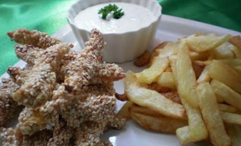 Mod de Preparare: Pieptul de pui se taie fasii se condimenteaza cu piper alb, boia dulce, praf de usturoi, sare si ghimbir. Se adauga si uleiul de masline si se lasa la marinat 30 min la frigider. Fasiile astfel pregatite se trec prin ou batut cu smantana apoi prin semintele de susan. Se aseaza pe o tava tapetata cu hartie de copt si se coc la foc potrivit. La jumatatea timpului de coacere se intorc ca sa se rumeneasca pe ambele parti.