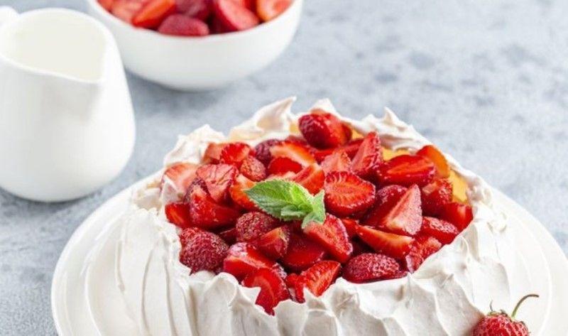 Mod de preparare: Pentru blat, mixezi albuşurile cu zahărul pudră, pe care îl încorporezi în 4 tranşe. La final, când compoziţia s-a întărit, pui amidonul. Tapetezi cu hârtie de copt o tavă şi desenezi pe foaia de copt un cerc cu diametrul de 22 cm. Aranjezi bezeaua, avâng grijă să aibă o înălţime de 10-12 cm, iar la mijloc formezi o adâncitură, în care vei pune crema şi fructele. Pe lateral, la exterior, cu o spatulă, faci modelul dorit. Coci blatul de bezea 1 oră şi 45 de minute, la 100 de grade. Laşi la răcit în cuptor, cu uşa întredeschisă. Pentru cremă, mixezi împreună frişca şi mascarpone, iar la final adaugi zeama şi coaja de lime.