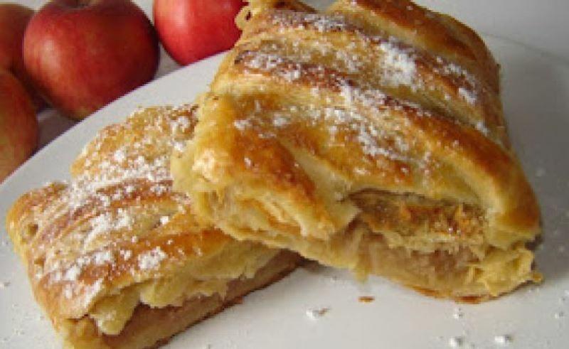 Pentru umplutura: mere, zahar, scortisoara si pesmet de biscuiti. Am intins prima foaie de aluat, pe mijloc am pus jumatate din compozitia cu mere, am facut taieturi aproximativ egale pe ambele laturi iar fasiile rezultate, le-am impletit peste umplutura de mere. La fel am procedat si cu a doua foaie. Le-am pus intr-o tava, le-am uns cu ou batut si am dat la cuptorul incins de dinainte, pana s-au rumenit frumos.