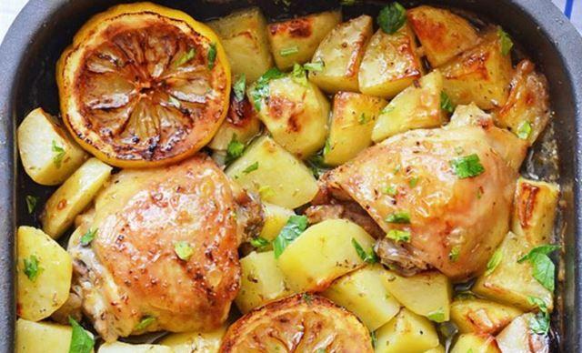 Mod de Preparare: Se taie cartofii in bucati mari, se pun intr-o cratita cu apa la fiert. Se lasa 8 minute din momentul in care apa incepe sa fiarba. Se incinge cuptorul la mare 230 grade Celsius. Se amesteca usturoiul cu sarea, oregano si 1 lingura de ulei si se freaca, apoi se adauga zeama de lamaie. Se incing 2 linguri de ulei in tigaie, iar cand este bine incins, se dau picioarele prin amestecul de lamaie si se pun in tigaie cu pielea in jos. Se lasa sa se rumeneasca 5 minute. Se intorc, se adauga ciupercile si cartofii scursi, se presara un praf de sare si piper, amestecul de lamaie ramas si se stropeste cu restul de 2 linguri ulei. Se baga in cuptorul incins pentru 20-25 minute pana cand totul este bine rumenit.