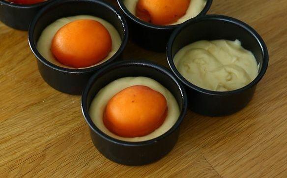 Se amesteca zaharul ramas cu mascarpone ramasa. Adaugati ouale. Apoi adaugati faina si praful de copt si amestecati bine. Terminati adaugand laptele pentru a relaxa aluatul. Puneti aluatul in ramekins unse cu unt. Dati drumul la cuptor si reglati-l la 180° C. Spalati caisele, taiati-le in 2 si scoateti samburele. Umpleti mijlocul cu amestecul de mascarpone + zahar si inchideti caisele. Azezati cate o caisa umpluta in fiecare ramekin cu aluat, apasand ușor. Coaceti 25 minute la 180°C.