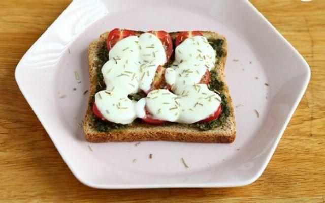 Mod de Preparare: Intinde sosul pesto pe o felie de paine alba. Deasupra, aranjati rosiile cherry taiate in jumatate ...... apoi felii de mozzarella. Coaceti timp de aproximativ 4 minute in cuptor in modul „gratar”. Inainte de servire, presarati rozmarin.