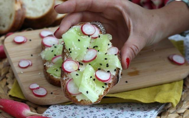 Mod de Preparare: Prajiti feliile de paine si intindeti pe ele crema de branza. Taiati fasii de castravete folosind un curatator si asezati-le peste branza. Taiati ridichile in felii subtiri si asezati-le peste castraveti. Presarati seminte de susan.