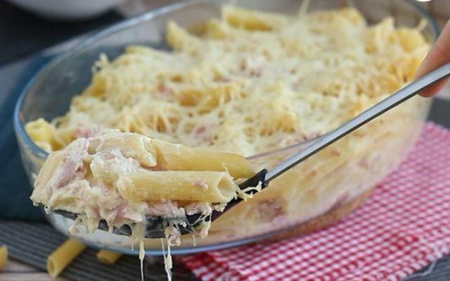 Mod de Preparare: Gatiti pastele in timpul indicat pe eticheta, in apa sarata, clocotita. Scurgeti pastele, adaugati uleiul de masline si amestecati. Taiati sunca si amestecati cu oul, smantana, sare, piper si 100 gr cascaval ras. Adaugați pastele si amestecati. Turnați preparatul intr-un vas potrivit pentru cuptor si acoperiti cu 50 gr de cascaval ras. Se introduce in cuptorul preincalzit la 180° C si se coace timp de 15 minute.