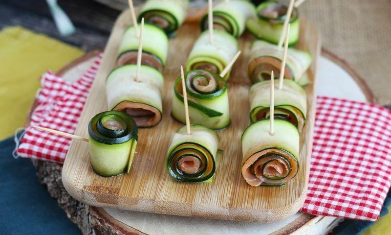 Felii de dovlecei, felii de somon afumat, o marinada pe baza de otet balsamic si ulei de masline: o reteta super usoara si rapida pentru aperitiv, fara gatit si extra proaspat.