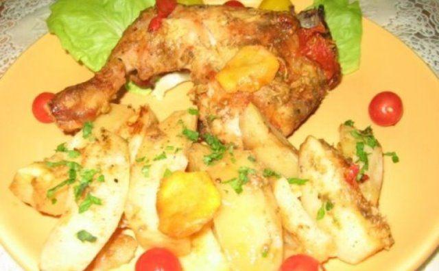 Mod de Preparare: Pulpele fara pielita se dau cu sare, piper, miere si mustar si se tin o ora la rece in frigider. Vasul roman se scufunda in apa pentru 40 minute. Morcovii, ceapa si usturoiul se curata si se taie felii subtiri rotunde, la fel ca si rosia. Ardeii se taie si ei fasii subtiri.Cartofii se curata si se taie in 4-6 fasii, depinde de marimea lui. Se scoate vasul roman din apa si pulpele de la rece. In vasul roman se pun cartofii, rondelele de ceapa si fasiile de ardei peste ei, apoi morcovii taiati si usturoiul. Cine doreste poate adauga un pahar cu vin alb si cimbru. Se pun deasupra pulpele peste care adaugam rosiile, bucatele de unt si cascaval ras. Punem 1/2 cana cu apa peste pulpe. Dam la cuptorul dinainte incalzit pina cand pulpele prind o culoare frumoasa maronie. Le intoarcem pe cealalta parte pentru vre-o 15 minute sa prinda crusta si aici si apoi se servesc cu cartofii langa.