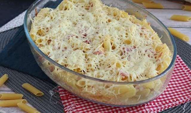Mod de Preparare: Gatiti pastele in timpul indicat pe eticheta, in apa sarata, clocotita. Scurgeti pastele, adaugati uleiul de masline si amestecati. Taiati sunca si amestecati cu oul, smantana, sare, piper si 100 gr cascaval ras. Adaugați pastele si amestecati. Turnați preparatul intr-un vas potrivit pentru cuptor si acoperiti cu 50 gr de cascaval ras. Se introduce in cuptorul preincalzit la 180° C si se coace timp de 15 minute.