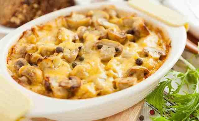 Mod de Preparare: Incalziti cuptorul la 200 grade C. Curatati si spalati ciupercile. Taiati-le felii daca sint prea mari sau bucati. Curatati ceapa si taiati-o solzisori. Caliti-o in ulei. Adaugati ciupercile si prajiti-le pentru cca. 8-10 minute. Adaugati smantana si supa si lasati sa fiarba 2-3 minute. Condimentati cu sare si piper, apoi lasati sa se raceasca. Pregatiti feliile de paine. Prajiti, pe rand, feliile de paine la toast. Ungeti fiecare felie cu unt. Taiati painea cubulete. Asezati-le intr-o forma de sufleu unsa cu unt. Presarati jumatate din cascavalul dat pe razatoare. Si ciupercile calite. Presarati restul de cascaval. Puneti la cuptor cca. 10-12 minute sau pana cand cascavalul se topeste si sufleul se rumeneste frumos. Dupa ce scoateti tava, presarati patrunjel tocat. Se mai poate adauga o minuscula-extra portie de smantana, direct in farfurie daca nu va sint pe plac mancarurile crocante.