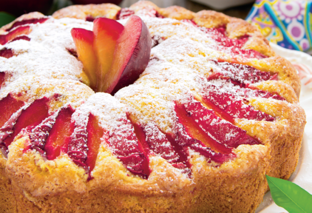 Mod de preparare: Tava de copt se unge cu unt si se pudreaza cu zahar inlaturand excesul. Se amesteca faina cu pudra de migdale, praful de copt si, separat, se freaca ouale cu zaharul. Peste crema de oua se adauga iaurtul, uleiul, amestecand dupa fiecare. Se adauga amestecul cu faina si se amesteca bine. Se toarna in tava, se repartizeaza uniform felii de prune si se coace 30 de minute. Se pudreaza cu zahar.