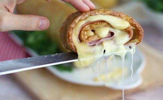 Mod de Preparare: Decojiti cartofii si dati-i pe razatoare. Bateti ouale, adaugati sare si piper si amestecati cu cartofii rasi. Adaugati ceapa taiata marunt. Turnati acest amestec intr-o tava de copt din silicon. Nivelati bine sa aveti o grosime uniforma. Coaceti 30 minute la 180°C. Intoarceti tava de silicon peste o hartie de copt si aranjati pe ea felii de cascaval taiat subtire sau dat pe razatoare. Acoperiti numai 2/3 din suprafata. Apoi, aranjați felii de șunca peste cascaval. Rulati in timp ce strangeti putin. Puneti ruloul in cuptorul fierbinte, timp de 5 minute pentru a topi cascavalul. Se taie cand e rece.