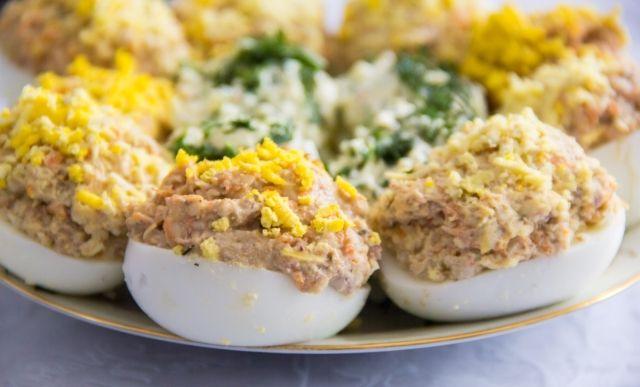 Mod de preparare: Fierbe ouale tare, cu sare din belsug, pentru circa 10 minute. Lasa-le apoi in apa rece si cojeste-le. Taie ouale in jumatati si scoate galbenusul fiecaruia. Combina galbenusul scos cu maioneza si iaurtul, apoi adauga mustarul, pudra de usturoi si paprika. Dupa ce ai omogenizat, incorporeaza si tonul maruntit, scurs cat mai bine de sos. Adauga telina verde tocata marunt si ceapa verde, potriveste de sare si piper. Umple ouale cu aceasta compozitie obtinuta. Serveste ouale umplute cu ton, presarate cu coaja de lamaie, pe un platou de aperitive, alaturi de alte preparate festive.