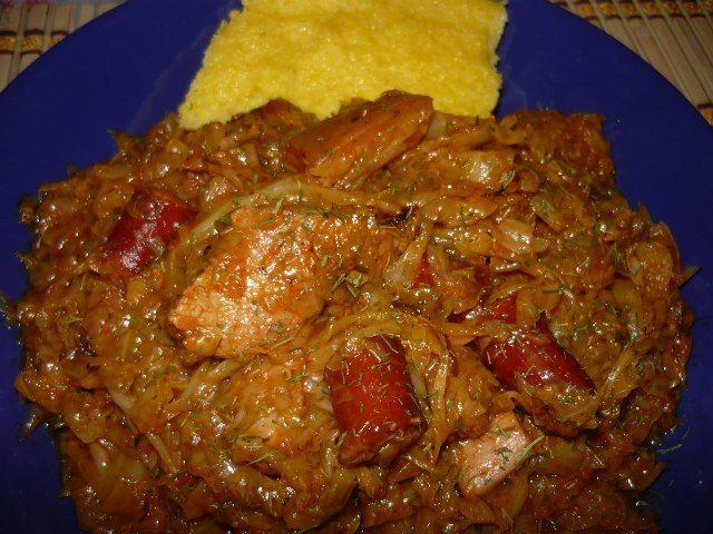Mod de preparare: Desfacem varza frunza cu frunza si o punem un apa rece circa 30 de minute. Scurgem de zeama si tocam varza marunt, fideluta. Kaiserul se taie in felii mai maricele. Intr-un vas punem un rand de varza, piper, cimbru, foi de dafin si jumatate din cantitatea de kaiser. Punem restul de varza, kaiser si sucul de rosii. Deasupra punem restul de afumatura. Dam la cuptor circa 1 ora si jumatate, pana cand varza este patrunsa bine, iar afumatura capata un aspect crocant. Servim varza calda cu mamaliga, sau paine dupa preferinta.