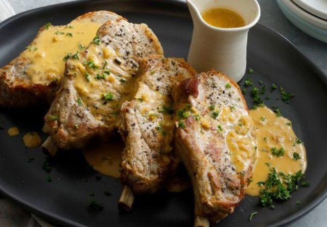 Mod de Preparare: Incalzim cuptorul. Tocam foarte marunt ceapa si usturoiul. Amestecam ceapa tocata cu usturoiul. Pregatim un bol in care punem uleiul. Adaugam 2 lingurite cu mustar si amestecam pana la omogenizare. Condimentam cotletele de porc cu sare si piper, pe ambele parti. Ungem carnea de porc cu amestecul de ulei si mustar, tot pe ambele parti. Presaram deasupra fiecarei bucati de carne amestecul de ceapa si usturoi, de data aceasta pe o singura parte. Apasam usor, astfel incat sa se formeze un fel de crusta. Pregatim o tava pentru cuptor in care aranjam cotletele de porc. Introducem tava in cuptorul incalzit la 230 de grade pentru aproximativ 35-40 de minute. Pregatim sosul – punem cele 2 lingurite cu mustar ramase peste smantana fermentata. Condimentam cu praf de curry sau boia de ardei si sare. Amestecam bine, pana cand obtinem un sos fin si omogen. Cand cotletele de porc sunt rumenite la baza, iar ceapa usor caramelizata, scoatem tava cu friptura din cuptor. Servim cotletele calde, cu sosul de smantana si mustar.