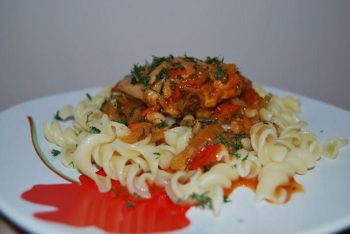 Mod de preparare: Se caleste ceapa, se adauga ardeiul tocat, apoi morcovul dat pe razatoare. Se aseaza pulpele in tigaie si se adauga apa cat sa acopere pulpele. Se condimenteaza si se lasa pe foc pana scade apa. La sfarsit se adauga sosul de rosii si mararul. Am servit cu paste.