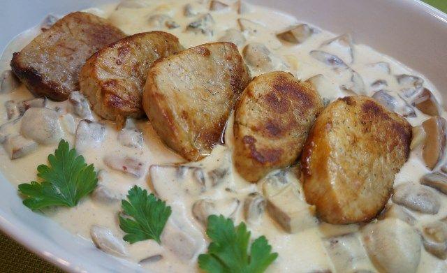 Mod de Preparare: Se curata muschiuletul de sidef si grasime. Se spala bine si se usuca prin tamponare cu prosoape de hartie. Se pun intr-o oala 5 litri de apa, sarea grunjoasa, cimbrul si rozmarinul, usturoiul, dafinul si piperul. Se da in clocot, apoi se acopera, se stinge flacara si se lasa sa infuzeze pana ce lichidul se raceste complet. Se introduce muschiuletul in saramura, se acopera si se lasa la marinat peste noapte. Se scoate apoi din saramura, se scurge bine si se sterge cu grija cu prosoape de hartie. Se lasa apoi sa se zvante, la temperatura camerei, circa 1-2 ore. Se tempereaza muschiuletul 1-2 ore, la temparatura camerei. Se taie apoi pe transversala, bucati de 2 cm grosime. Se sareaza si se pipereza dupa gust. Se incinge restul de ulei intr-o tigaie neaderenta si se prajesc bucatelele de carne 2-3 minute pe fiecare parte, sau cat este necesar ca sa fie facute si rumenite dupa dorinta. Se face acest lucru in transe, ca sa nu se aglomereze tigaia (se prajesc cate 4-6 felii odata).Se scot din tigaie bucatile prajite si se asaza pe un gratar metalic, asezat deasupra unei farfurii. Se acopera lejer cu folie metalica si se lasa sa stea 10 minute, cat timp de prepara sosul. Se adauga in tigaie ceapa si se sareaza. Daca este nevoie se mai adauga 1 lingura de ulei. Se prajeste la foc mediu, racaind fundul tigaii ca sa se curete de micile resturi caramelizate lasate de carne. Se adauga ciupercutele si se gatesc 2-3 minute, amestecand ocazional. Se adauga brandy si se inclina tigaia ca sa se aprinda. Se flambeaza ciupercutele pana ce flacara se stinge de la sine. Alcoolul a ars astfel, iar aroma bauturii a ramas in sos. Se adauga smantana si sucul lasat in farfuria de sub grilajul pe care se odihnesc feliutele de carne prajita. Se amesteca 2 minute, pana ce sosul se ingroasa usor. Se adauga mararul si se amesteca rapid. Se ia tigaia de pe foc. Se serveste carnea cu sos alb de ciuperci si salata verde.