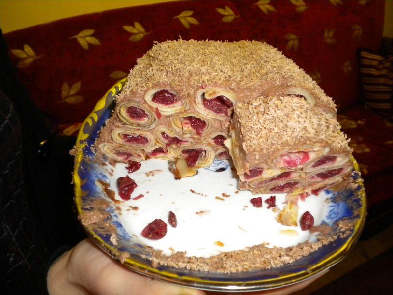Clatitele se umple cu dulceata de visine si se ruleaza, apoi se aseaza pe un platou cate un strat de clatite rulate apoi punem crema, si asa pana ce terminam toate clatitele.(Clatitele trebuie asezate pe platou astfel incat sa ia forma unui tort). Pe deasupra punem un strat mai gros de crema si ornam cu nuca macinata.