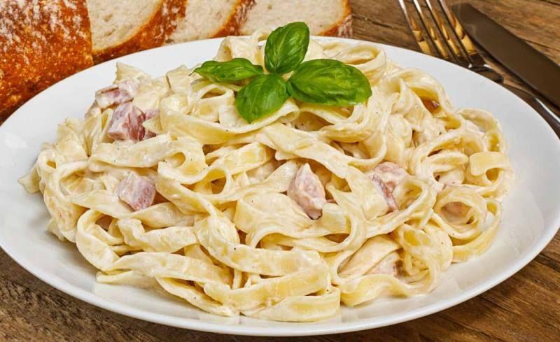 Mod de Preparare: Se fierb spaghetele conform indicatiilor de pe ambalaj, iar uleiul de masline il adaugati cand le veti scurge de apa. Se prajesc cubuletele de bacon, se scot si se lasa pe hartie de bucatarie sa se scurga. Se calesc ceapa si usturoiul, se sting cu vin si se lasa sa fiarba putin. Se adauga cuburile de bacon si ouale batute cu smantana si parmezan, amestecand continuu. Se adauga pastele si se amesteca bine. Se condimenteaza cu sare si piper dupa gust si se presara patrunjel tocat. Va doresc pofta buna!